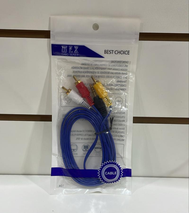 P2 X 3 RCA Comprimento: 1.5 metros O cabo P2 Estéreo x 3 RCA AV é utilizado para conectar aparelhos de áudio dos mais variados tipos, dentre eles: MP3, Ipod, Celular, Smartphone, TV, Notebook, CD Player ou qualquer outro aparelho de som com entrada auxiliar RCA.