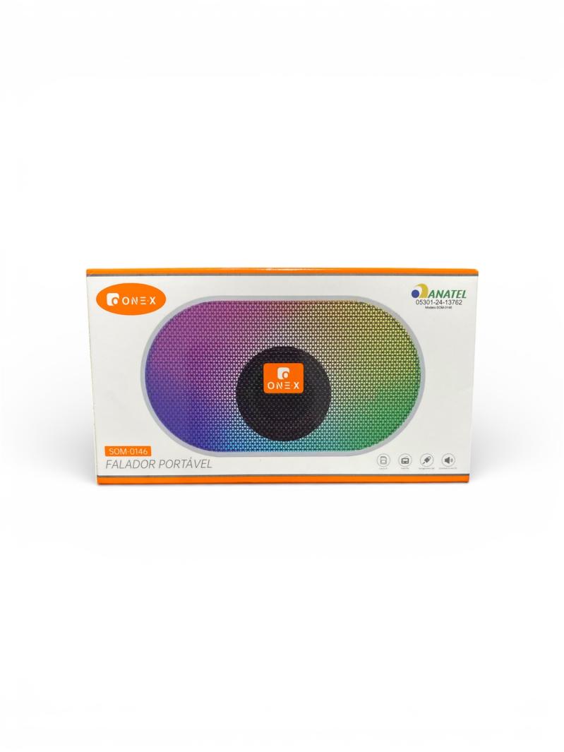 A Caixa de Som Portátil Onex SOM-0145 é um modelo compacto com luzes LED coloridas, conexão Bluetooth e rádio FM.